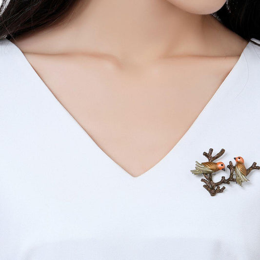 Roast Paint Two Bird On Tree Vintage Brooch Pin
