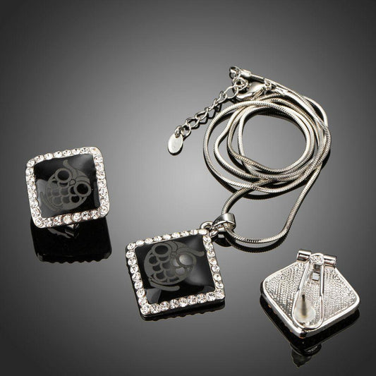 Black Square Owl Print Necklace & Earrings Set