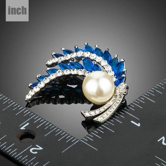 Royal Blue Leaves Clear Rhinestone Cubic Zirconia Stimulated Pearl Fashion Brooch