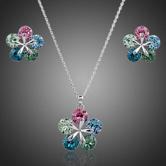 White Gold Multi Color Flower Stellux Austrian Necklace and Earrings Set