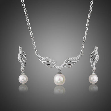 Clear Cubic Zirconia With Pearl Flower Pendant and Drop Earrings Set