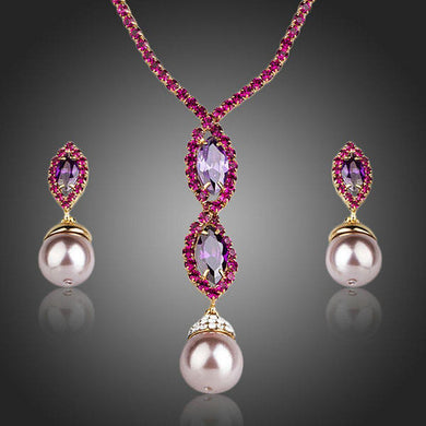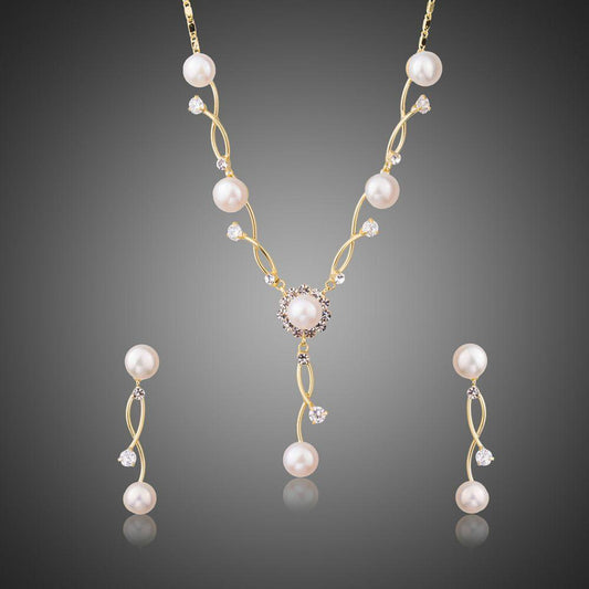 Gold Color Imitation Pearl Cubic Zirconia Earrings and Necklace Set