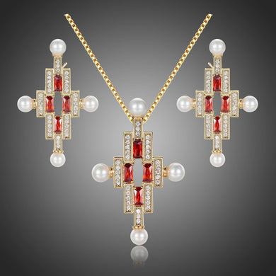 Red Cubic Zirconia Pearl Cross Necklace Earrings Bridal Jewelry Set
