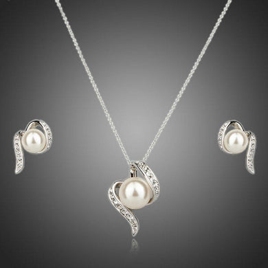 Round Pearl with Cubic Zirconia Pendant Necklace & Drop Earrings Set