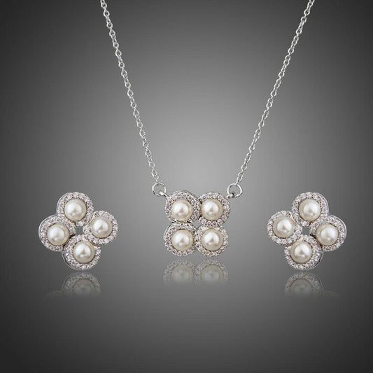 Silver Tone Simulated Pearls with Stellux Austrian Clover Stud Earrings and Necklace Set