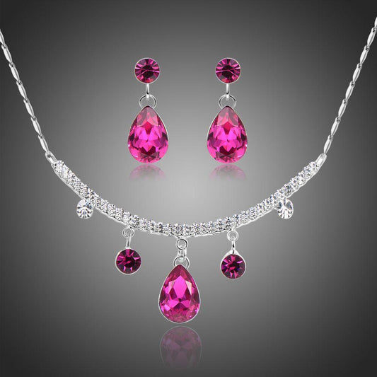 Magenta Pearl Necklace and Drop Earring Crystal White Gold Jewellery Set