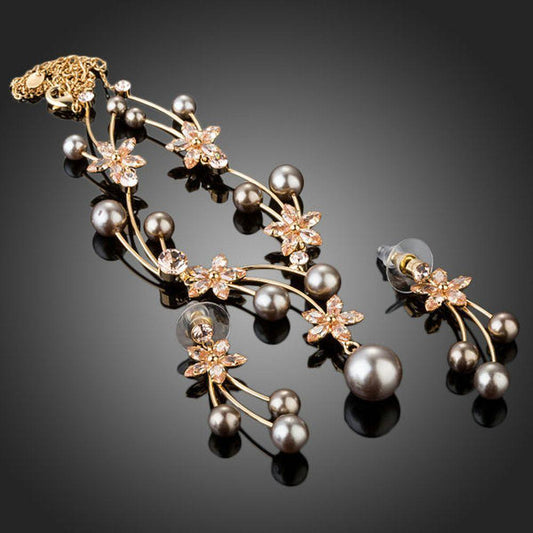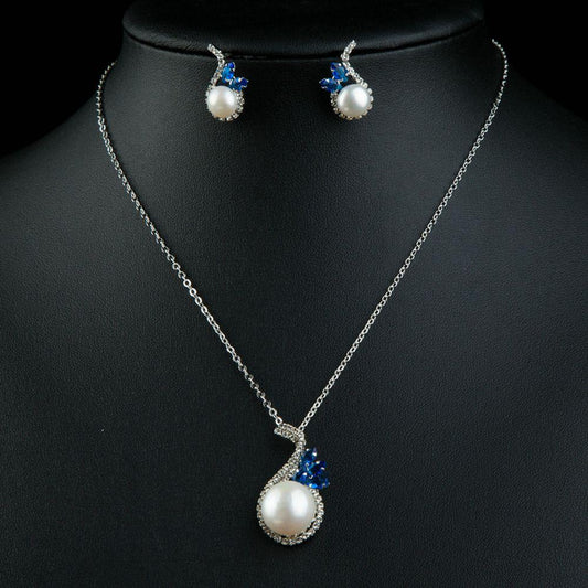 Pearl Fashion Blue CZ Flower Stud Earrings and Necklace Set