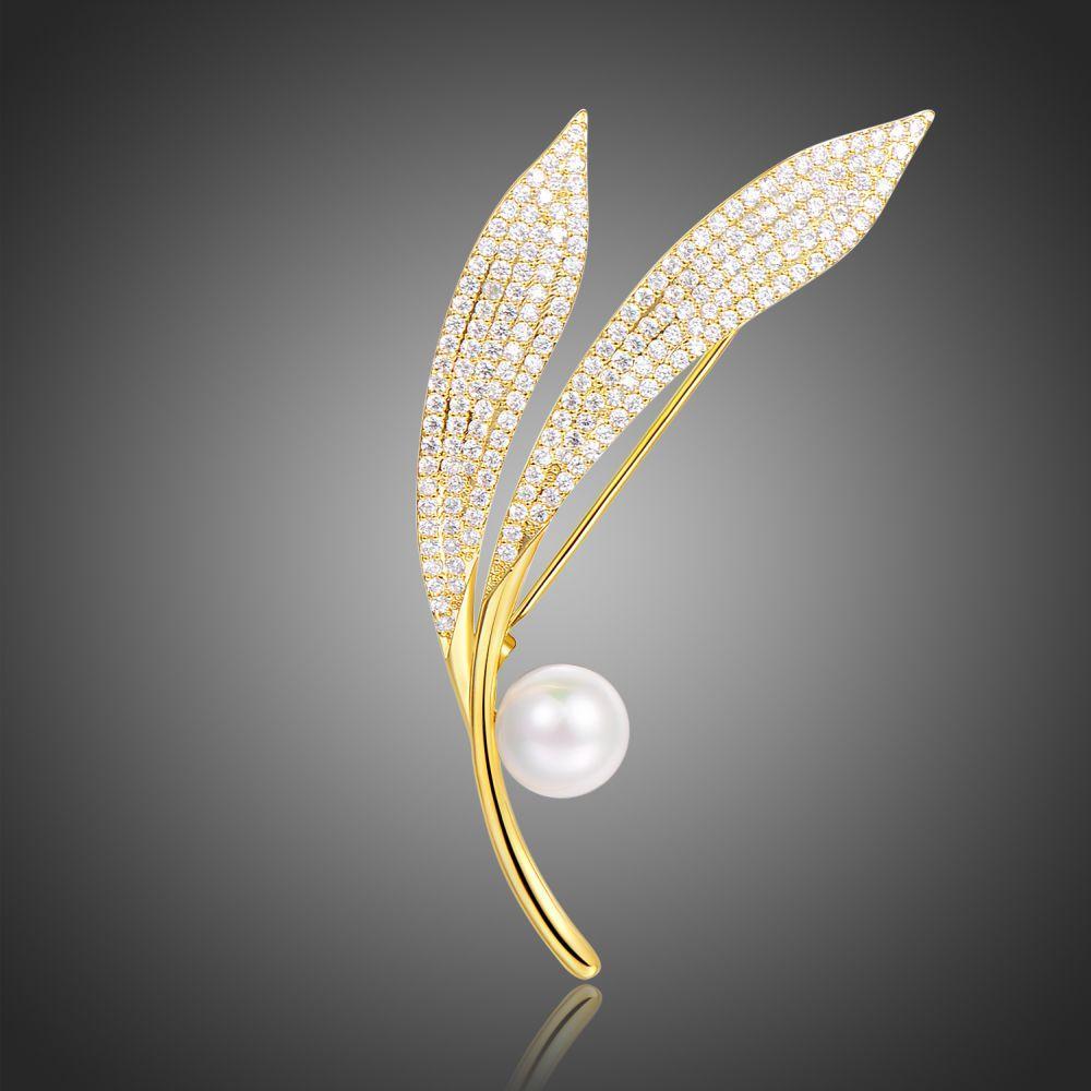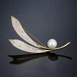 Add some sparks to your beautiful outfit with this classy fashionable Brooch. The feature of this stunning golden branch is having two shape leaves decorated with clear cubic zirconia. A cute shiny white pearl makes it look even prettier.