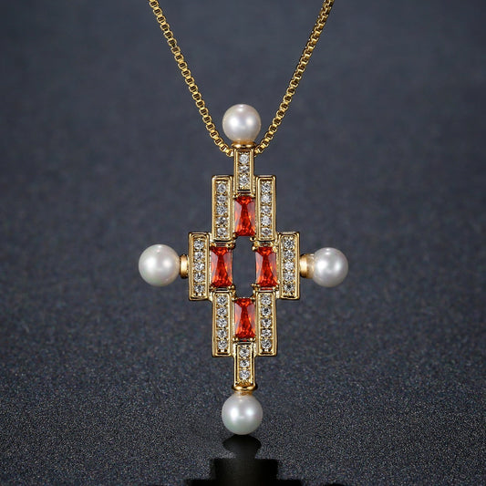 Red Cubic Zirconia Cross Pearl Pendant Necklace KPN0277