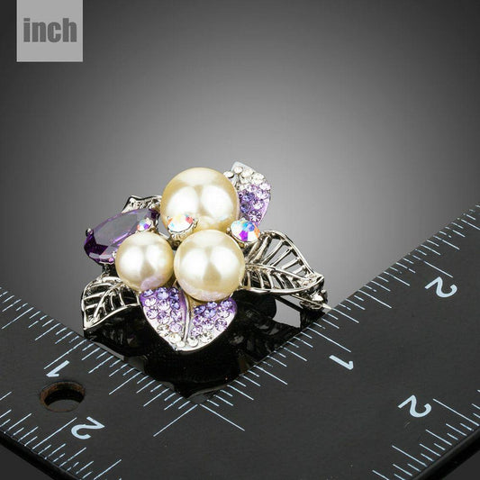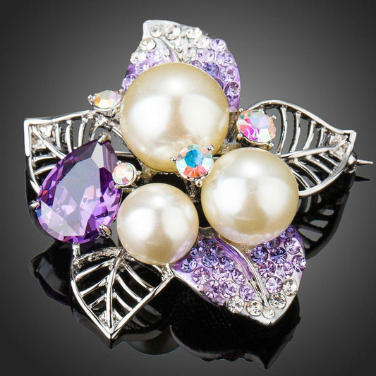 White Gold Color Purple Cubic Zirconia Stimulated Pearl Flower Brooch