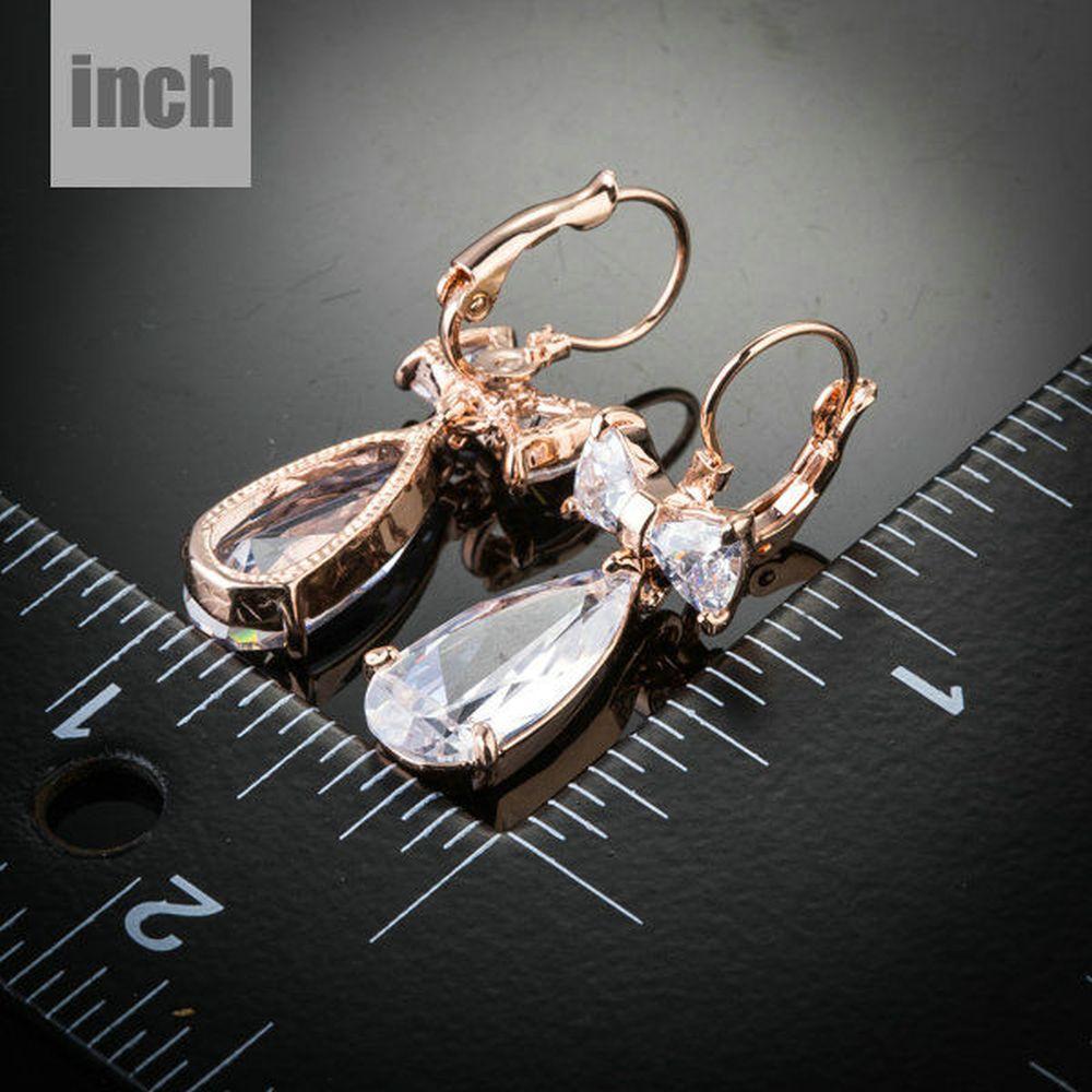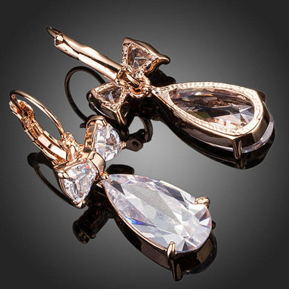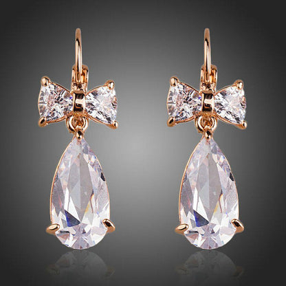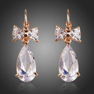 The rose gold plated clear bowknot tie cubic Zirconia tear drop earring is here for the taking. The earring is looks romantic with its water drop design and a shiny outlook due to rose gold plating. The zirconia crystals take this earring to a next level.