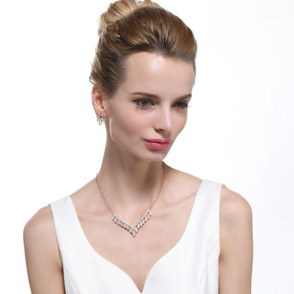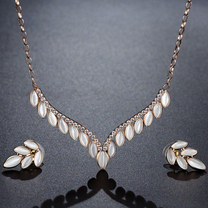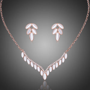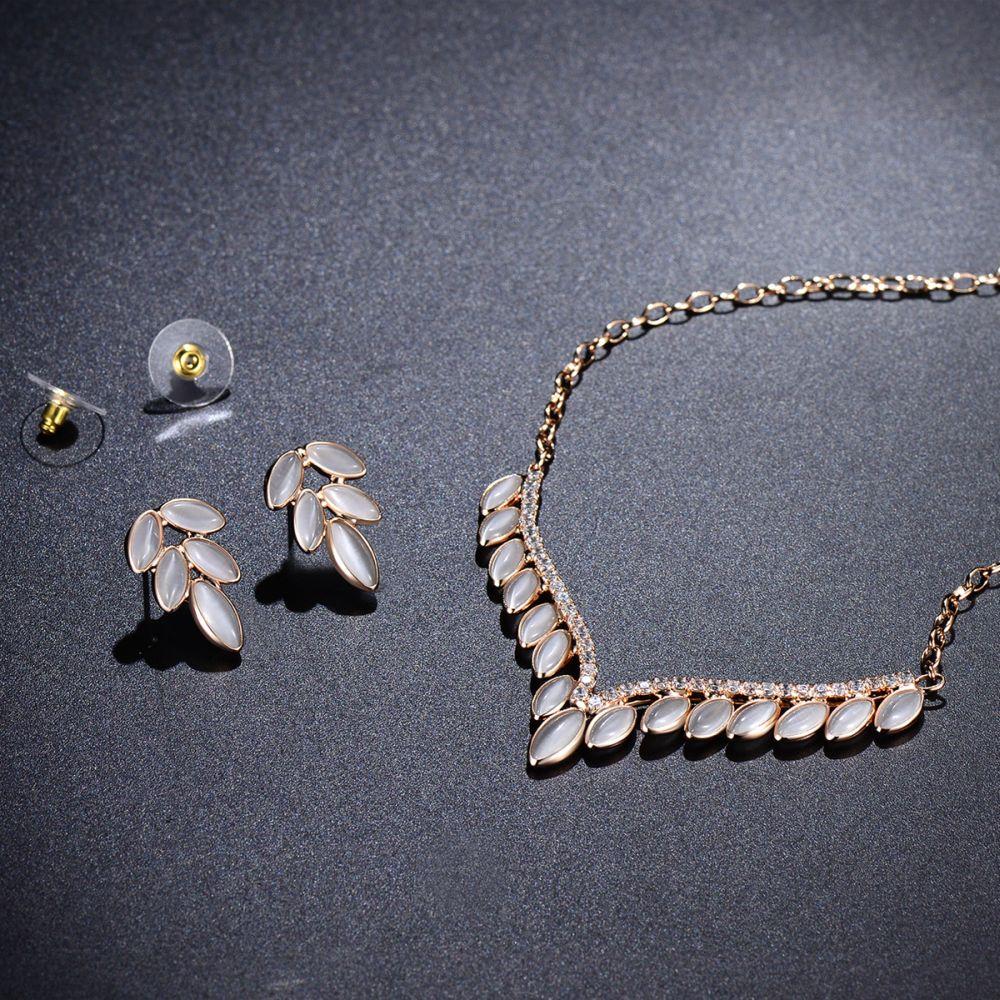 This marvelous set contains a pretty necklace piece having oval shaped stones and a pair of matching dangle earrings. The whole piece is real rose gold plated and has 3 times fine polishing. This jewelry set is perfect for any engagement, wedding, events or any casual party.