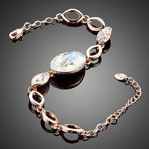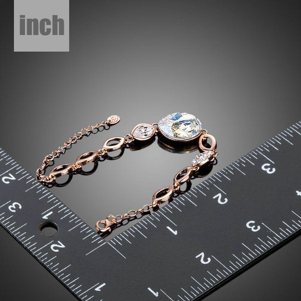 A rose gold plated bracelet for our rosy ladies! This gorgeous water drop shaped fashionable bracelet uses Stellux Austrian Crystals as main stone with Rhinestone materials. The main structure of Copper looks with rose gold plating. Using these materials made the bracelet very light weighing only 8.6 g with 17 cm long chain extended to 3 cm long.