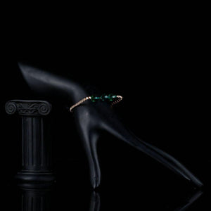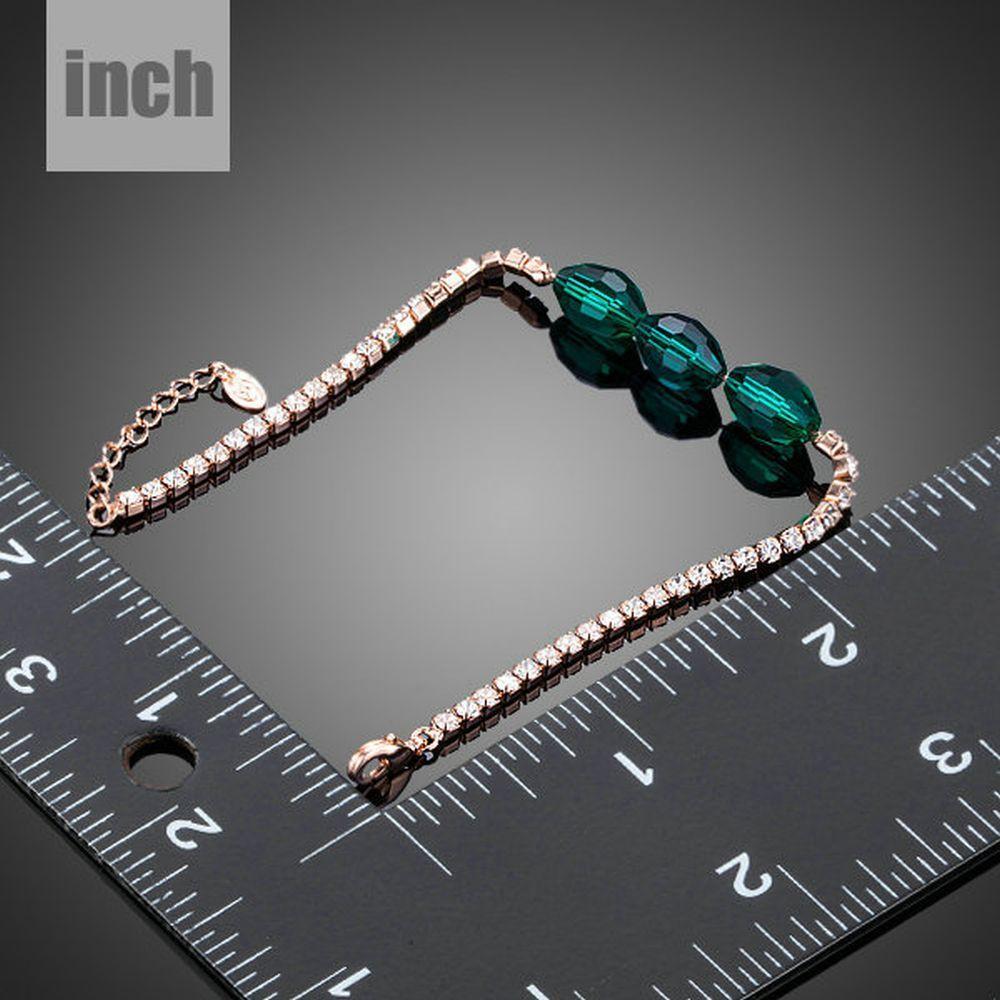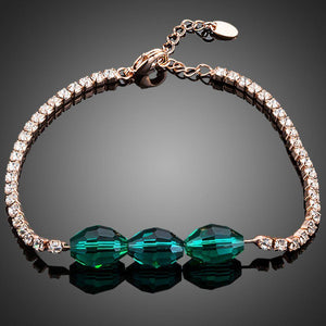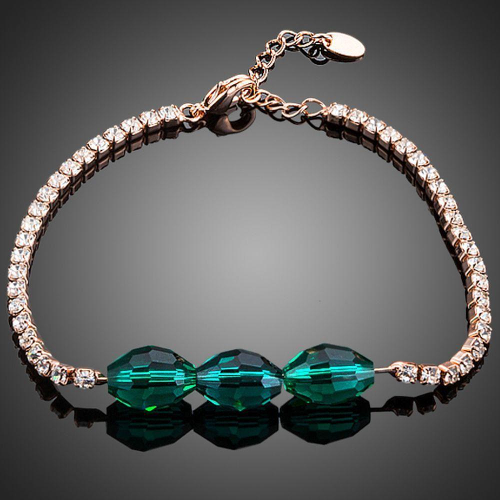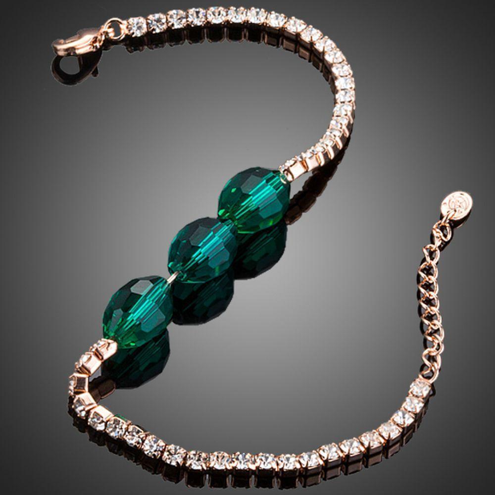 This super gorgeous bracelet is made out of cubic zirconia. This 3 pieces green crystals and top grade tiny CZ diamonds made the bracelet so lightweight only 5.1 g. Rose gold plating on copper body with a prong setting is its special features.