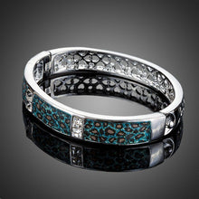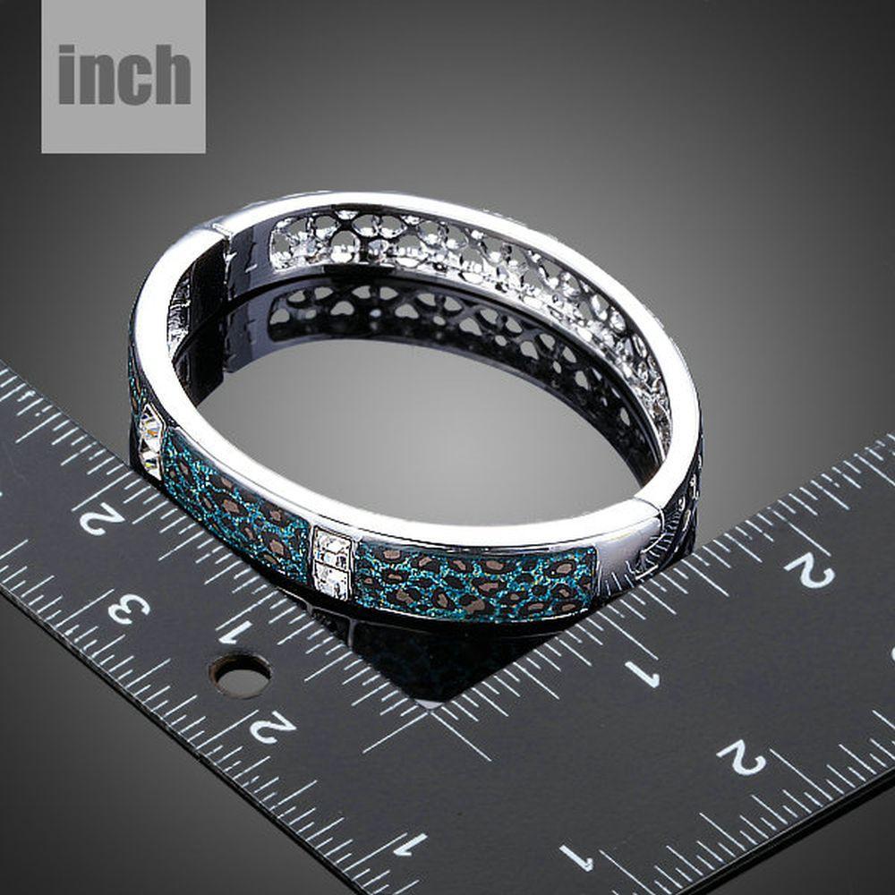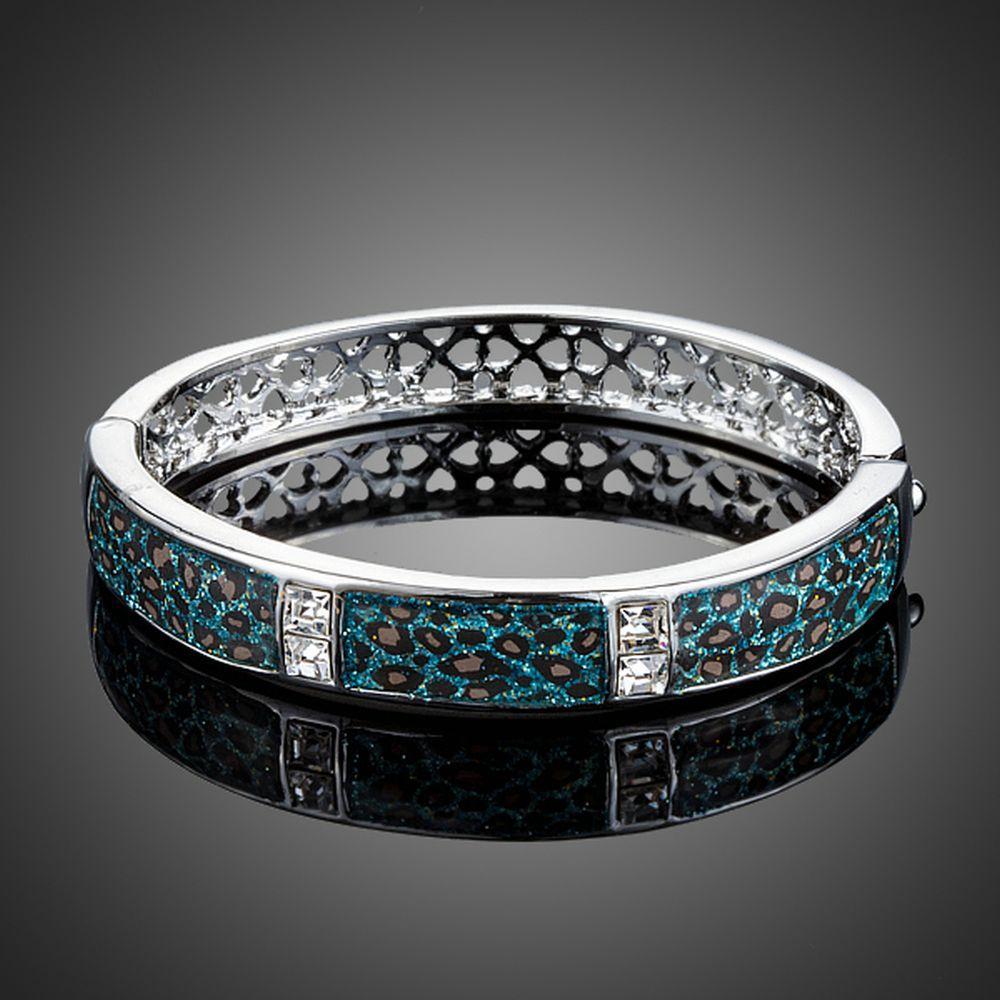 It is a light blue color stellux Austrian crystal bracelet. The twist is it has blue leopard pattern on it which makes all the difference.