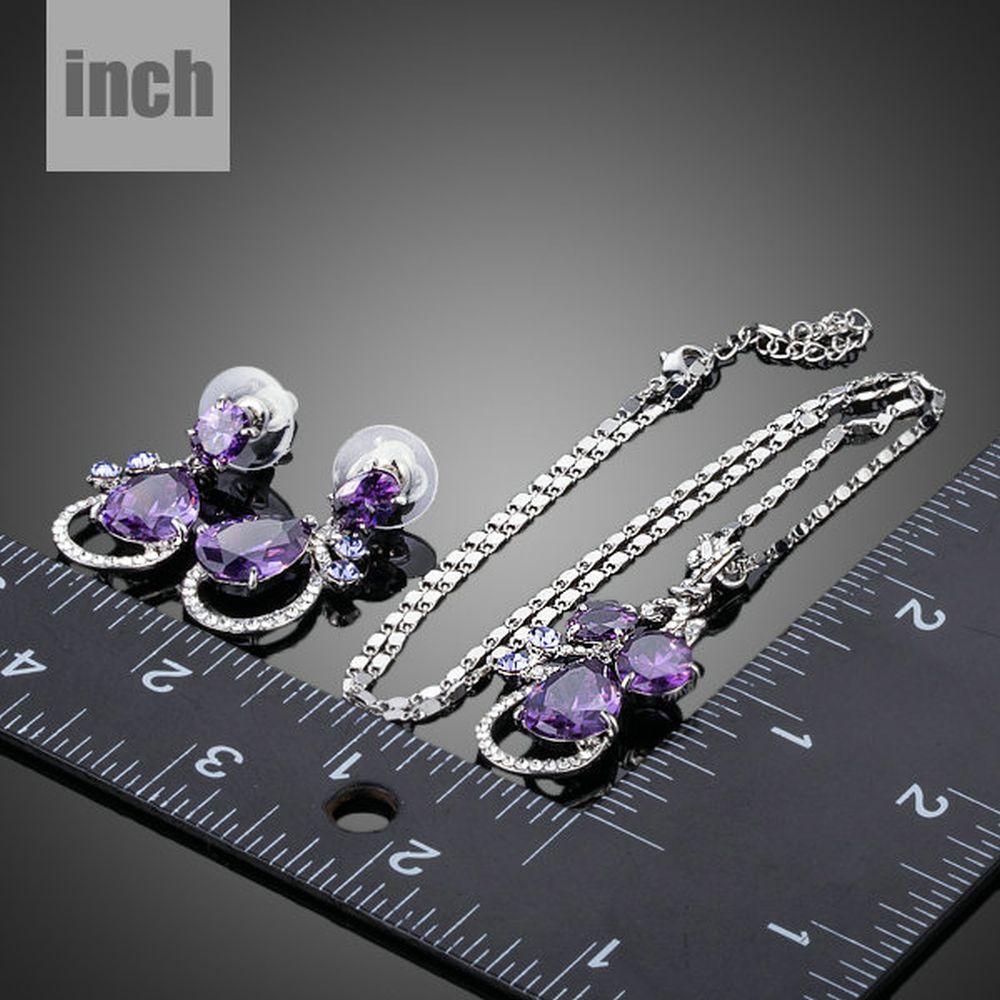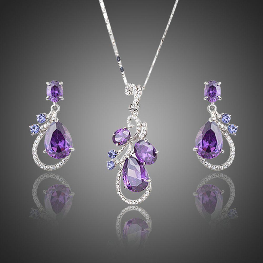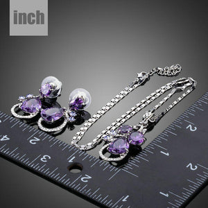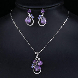 Purple Cubic Zirconia Water Drop Earrings and Necklace Jewelry Set